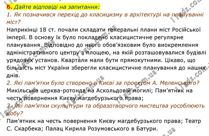 6. Дайте відповіді на запитання: 1. Як позначився перехід до класицизму в архітектурі на плануванні міст? Наприкінці 18 ст. почали складати генеральні плани міст Російської імперії. В основу їх було покладено класицистичне регулярне планування. Відповідно до нього обов’язковим було виокремлення адміністративного центру з площею, на якій розташовувалися будівлі урядових установ. Квартали мали бути прямокутними. Цікаво, що більшість міст України зберегли класицистичне планування до наших днів. 2. Які пам’ятки було створено в Києві за проектом А. Меленського? Микільська церква-ротонда на Аскольдовій могилі; Пам’ятник на честь повернення Києву магдебурзького права; 3. Які пам’ятки скульптури та образотворчого мистецтва уособлюють добу? Пам’ятник на честь повернення Києву магдебурзького права; Театр С. Скарбека; Палац Кирила Розумовського в Батури.
