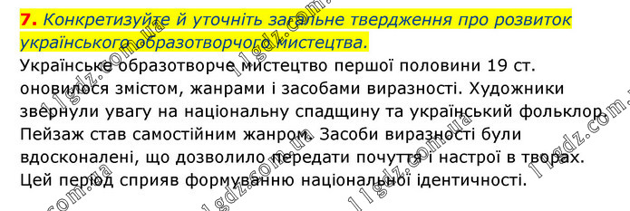 7. Конкретизуйте й уточніть загальне твердження про розвиток українського образотворчого мистецтва. Українське образотворче мистецтво першої половини 19 ст. оновилося змістом, жанрами і засобами виразності. Художники звернули увагу на національну спадщину та український фольклор. Пейзаж став самостійним жанром. Засоби виразності були вдосконалені, що дозволило передати почуття і настрої в творах. Цей період сприяв формуванню національної ідентичності.