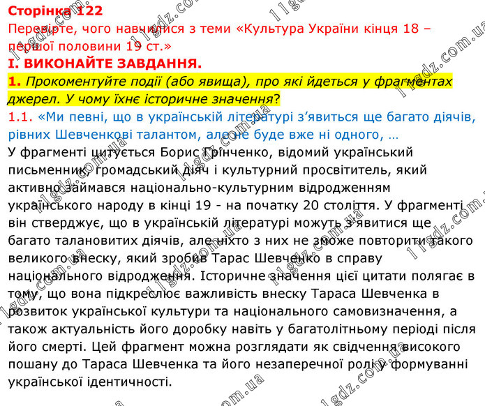 Перевірте, чого навчилися з теми «Культура України кінця 18 – першої половини 19 ст.» І. ВИКОНАЙТЕ ЗАВДАННЯ. 1. Прокоментуйте події (або явища), про які йдеться у фрагментах джерел. У чому їхнє історичне значення? 1.1. «Ми певні, що в українській літературі з’явиться ще багато діячів, рівних Шевченкові талантом, але не буде вже ні одного, … У фрагменті цитується Борис Грінченко, відомий український письменник, громадський діяч і культурний просвітитель, який активно займався національно-культурним відродженням українського народу в кінці 19 - на початку 20 століття. У фрагменті він стверджує, що в українській літературі можуть з'явитися ще багато талановитих діячів, але ніхто з них не зможе повторити такого великого внеску, який зробив Тарас Шевченко в справу національного відродження. Історичне значення цієї цитати полягає в тому, що вона підкреслює важливість внеску Тараса Шевченка в розвиток української культури та національного самовизначення, а також актуальність його доробку навіть у багатолітньому періоді після його смерті. Цей фрагмент можна розглядати як свідчення високого пошану до Тараса Шевченка та його незаперечної ролі у формуванні української ідентичності.