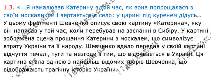 1.3. «...Я намалював Катерину в той час, як вона попрощалася з своїм москаликом і вертається в село; у царині під куренем дідусь… У цьому фрагменті Шевченко описує свою картину «Катерина», яку він написав у той час, коли перебував на засланні в Сибіру. У картині зображена сцена прощання Катерини з москалем, що символізує втрату України та її народу. Шевченко вдало передав у своїй картині відчуття печалі, туги та незгоди з тим, що відбувається в Україні. Ця картина стала однією з найбільш відомих творів Шевченка, що відображають трагічну історію України.