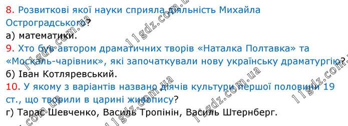 8. Розвиткові якої науки сприяла діяльність Михайла Остроградського? а) математики. 9. Хто був автором драматичних творів «Наталка Полтавка» та «Москаль-чарівник», які започаткували нову українську драматургію? б) Іван Котляревський. 10. У якому з варіантів названо діячів культури першої половини 19 ст., що творили в царині живопису? г) Тарас Шевченко, Василь Тропінін, Василь Штернберг.