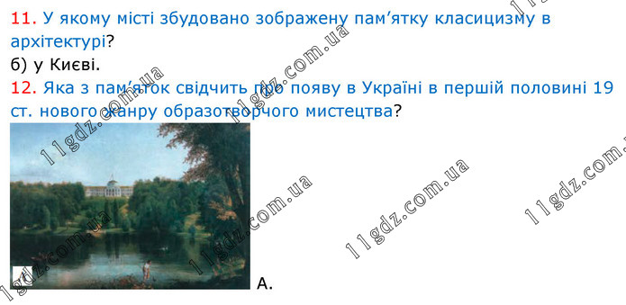 11. У якому місті збудовано зображену пам’ятку класицизму в архітектурі? б) у Києві. 12. Яка з пам’яток свідчить про появу в Україні в першій половині 19 ст. нового жанру образотворчого мистецтва? А.