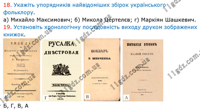 18. Укажіть упорядників найвідоміших збірок українського фольклору. а) Михайло Максимович; б) Микола Цертелєв; г) Маркіян Шашкевич. 19. Установіть хронологічну послідовність виходу друком зображених книжок. Б, Г, В, А