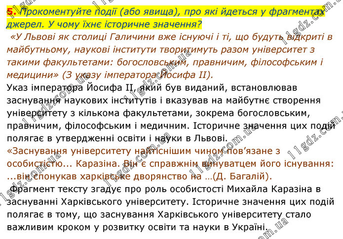 Прокоментуйте події (або явища), про які йдеться у фрагментах джерел. У чому їхнє історичне значення? «У Львові як столиці Галичини вже існуючі і ті, що будуть відкриті в майбутньому, наукові інститути творитимуть разом університет з такими факультетами: богословським, правничим, філософським і медицини» (З указу імператора Йосифа ІІ). Указ імператора Йосифа ІІ, який був виданий, встановлював заснування наукових інститутів і вказував на майбутнє створення університету з кількома факультетами, зокрема богословським, правничим, філософським і медичним. Історичне значення цих подій полягає в утвердженні освіти і науки в Львові. «Заснування університету найтіснішим чином пов’язане з особистістю... Каразіна. Він є справжнім винуватцем його існування: ...він спонукав харківське дворянство на …(Д. Багалій). Фрагмент тексту згадує про роль особистості Михайла Каразіна в заснуванні Харківського університету. Історичне значення цих подій полягає в тому, що заснування Харківського університету стало важливим кроком у розвитку освіти та науки в Україні.