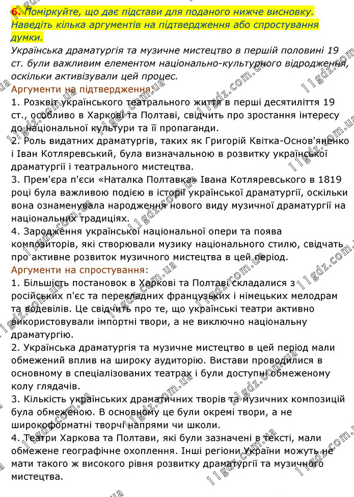 Поміркуйте, що дає підстави для поданого нижче висновку. Наведіть кілька аргументів на підтвердження або спростування думки. Українська драматургія та музичне мистецтво в першій половині 19 ст. були важливим елементом національно-культурного відродження, оскільки активізували цей процес. Аргументи на підтвердження: 1. Розквіт українського театрального життя в перші десятиліття 19 ст., особливо в Харкові та Полтаві, свідчить про зростання інтересу до національної культури та її пропаганди. 2. Роль видатних драматургів, таких як Григорій Квітка-Основ'яненко і Іван Котляревський, була визначальною в розвитку української драматургії і театрального мистецтва. 3. Прем'єра п'єси «Наталка Полтавка» Івана Котляревського в 1819 році була важливою подією в історії української драматургії, оскільки вона ознаменувала народження нового виду музичної драматургії на національних традиціях. 4. Зародження української національної опери та поява композиторів, які створювали музику національного стилю, свідчать про активне розвиток музичного мистецтва в цей період. Аргументи на спростування: 1. Більшість постановок в Харкові та Полтаві складалися з російських п'єс та перекладних французьких і німецьких мелодрам та водевілів. Це свідчить про те, що українські театри активно використовували імпортні твори, а не виключно національну драматургію. 2. Українська драматургія та музичне мистецтво в цей період мали обмежений вплив на широку аудиторію. Вистави проводилися в основному в спеціалізованих театрах і були доступні обмеженому колу глядачів. 3. Кількість українських драматичних творів та музичних композицій була обмеженою. В основному це були окремі твори, а не широкоформатні творчі напрями чи школи. 4. Театри Харкова та Полтави, які були зазначені в тексті, мали обмежене географічне охоплення. Інші регіони України можуть не мати такого ж високого рівня розвитку драматургії та музичного мистецтва.