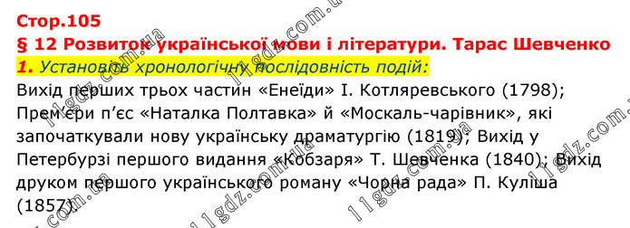 § 12 Розвиток української мови і літератури. Тарас Шевченко 1. Установіть хронологічну послідовність подій: Вихід перших трьох частин «Енеїди» І. Котляревського (1798); Прем’єри п’єс «Наталка Полтавка» й «Москаль-чарівник», які започаткували нову українську драматургію (1819); Вихід у Петербурзі першого видання «Кобзаря» Т. Шевченка (1840); Вихід друком першого українського роману «Чорна рада» П. Куліша (1857).
