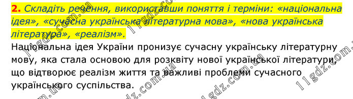2. Складіть речення, використавши поняття і терміни: «національна ідея», «сучасна українська літературна мова», «нова українська література», «реалізм». Національна ідея України пронизує сучасну українську літературну мову, яка стала основою для розквіту нової української літератури, що відтворює реалізм життя та важливі проблеми сучасного українського суспільства.
