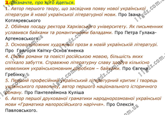 Визначте, про кого йдеться. 1. Автор першого твору, що засвідчив появу нової української літератури й нової української літературної мови. Про Івана Котляревського 2. Обіймав посаду ректора Харківського університету. Як письменник уславився байками та романтичними баладами. Про Петра Гулака-Артемовського 3. Основоположник художньої прози в новій українській літературі. Про Григорія Квітку-Основ'яненка 4. Писав романи та повісті російською мовою, більшість яких спіткало забуття. Справжню літературну славу здобув кількісно невеликим українськомовним доробком – байками. Про Євгена Гребінку 5. Перший професійний український літературний критик і творець українського правопису, автор першого національного історичного роману. Про Пантелеймона Куліша 6. Автор першої друкованої граматики народнорозмовної української мови «Граматика малоросійського наріччя». Про Олексія Павловського.