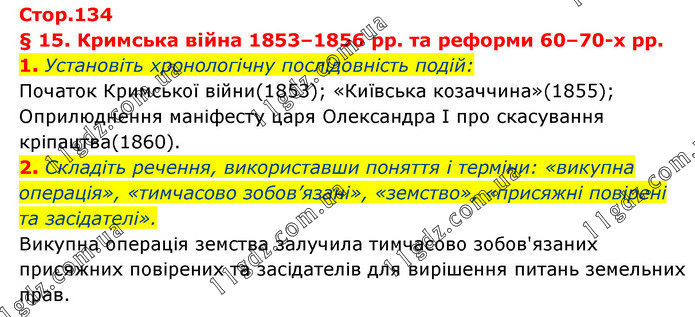 § 15. Кримська війна 1853–1856 рр. та реформи 60–70-х рр. 1. Установіть хронологічну послідовність подій: Початок Кримської війни(1853); «Київська козаччина»(1855); Оприлюднення маніфесту царя Олександра І про скасування кріпацтва(1860). 2. Складіть речення, використавши поняття і терміни: «викупна операція», «тимчасово зобов’язані», «земство», «присяжні повірені та засідателі». Викупна операція земства залучила тимчасово зобов'язаних присяжних повірених та засідателів для вирішення питань земельних прав.