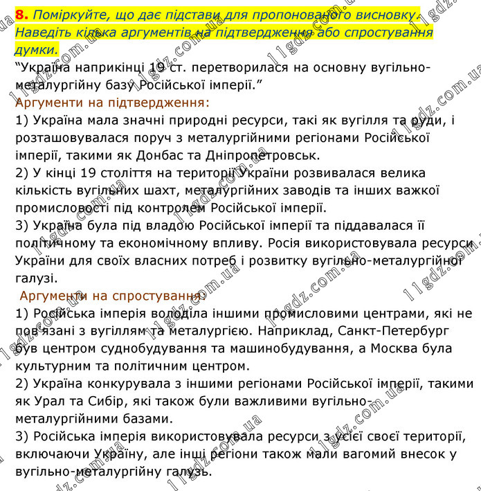 Поміркуйте, що дає підстави для пропонованого висновку. Наведіть кілька аргументів на підтвердження або спростування думки. “Україна наприкінці 19 ст. перетворилася на основну вугільно-металургійну базу Російської імперії.” Аргументи на підтвердження: 1) Україна мала значні природні ресурси, такі як вугілля та руди, і розташовувалася поруч з металургійними регіонами Російської імперії, такими як Донбас та Дніпропетровськ. 2) У кінці 19 століття на території України розвивалася велика кількість вугільних шахт, металургійних заводів та інших важкої промисловості під контролем Російської імперії. 3) Україна була під владою Російської імперії та піддавалася її політичному та економічному впливу. Росія використовувала ресурси України для своїх власних потреб і розвитку вугільно-металургійної галузі. Аргументи на спростування: 1) Російська імперія володіла іншими промисловими центрами, які не пов'язані з вугіллям та металургією. Наприклад, Санкт-Петербург був центром суднобудування та машинобудування, а Москва була культурним та політичним центром. 2) Україна конкурувала з іншими регіонами Російської імперії, такими як Урал та Сибір, які також були важливими вугільно-металургійними базами. 3) Російська імперія використовувала ресурси з усієї своєї території, включаючи Україну, але інші регіони також мали вагомий внесок у вугільно-металургійну галузь.