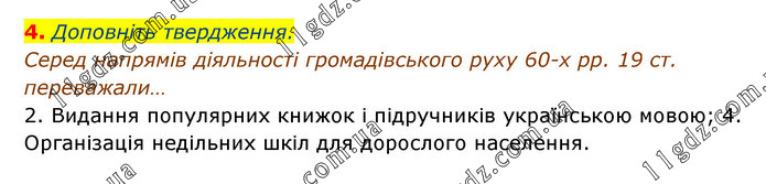 Доповніть твердження. Серед напрямів діяльності громадівського руху 60-х рр. 19 ст. переважали… 2. Видання популярних книжок і підручників українською мовою; 4. Організація недільних шкіл для дорослого населення.