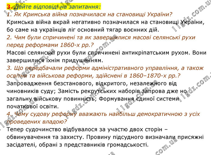 Дайте відповіді на запитання: 1. Як Кримська війна позначилася на становищі України? Кримська війна вкрай негативно позначилася на становищі України, бо саме на українців ліг основний тягар воєнних дій. 2. Чим були спричинені та як завершилися масові селянські рухи перед реформами 1860-х рр.? Масові селянські рухи були спричинені антикріпатським рухом. Вони завершилися їхнім придушенням. 3. Що передбачали реформи адміністративного управління, а також освітня та військова реформи, здійснені в 1860–1870-х рр.? Запровадження безстанового, відкритого, незалежного від чиновників суду; Замість рекрутських наборів запрова дже но загальну військову повинність; Формування єдиної системи початкової освіти. 4. Чому судову реформу вважають найбільш демократичною з усіх проведених владою? Тепер судочинство відбувалося за участю двох сторін – обвинувачення та захисту. Провину підсудного визначали присяжні засідателі, обрані з представників громадськості.