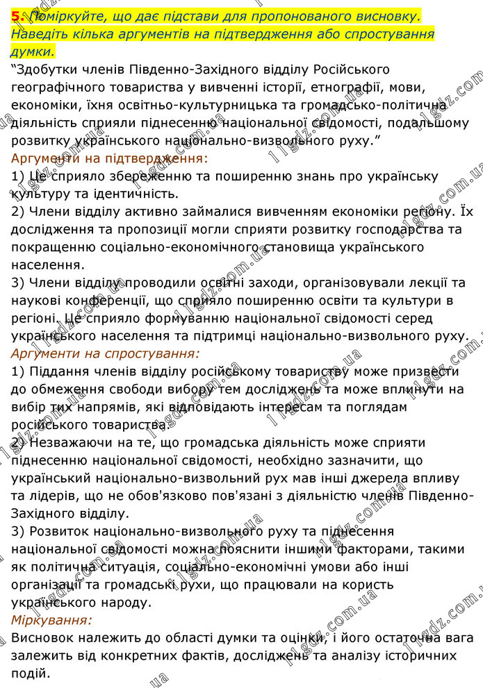 Поміркуйте, що дає підстави для пропонованого висновку. Наведіть кілька аргументів на підтвердження або спростування думки. “Здобутки членів Південно-Західного відділу Російського географічного товариства у вивченні історії, етнографії, мови, економіки, їхня освітньо-культурницька та громадсько-політична діяльність сприяли піднесенню національної свідомості, подальшому розвитку українського національно-визвольного руху.” Аргументи на підтвердження: 1) Це сприяло збереженню та поширенню знань про українську культуру та ідентичність. 2) Члени відділу активно займалися вивченням економіки регіону. Їх дослідження та пропозиції могли сприяти розвитку господарства та покращенню соціально-економічного становища українського населення. 3) Члени відділу проводили освітні заходи, організовували лекції та наукові конференції, що сприяло поширенню освіти та культури в регіоні. Це сприяло формуванню національної свідомості серед українського населення та підтримці національно-визвольного руху. Аргументи на спростування: 1) Піддання членів відділу російському товариству може призвести до обмеження свободи вибору тем досліджень та може вплинути на вибір тих напрямів, які відповідають інтересам та поглядам російського товариства. 2) Незважаючи на те, що громадська діяльність може сприяти піднесенню національної свідомості, необхідно зазначити, що український національно-визвольний рух мав інші джерела впливу та лідерів, що не обов'язково пов'язані з діяльністю членів Південно-Західного відділу. 3) Розвиток національно-визвольного руху та піднесення національної свідомості можна пояснити іншими факторами, такими як політична ситуація, соціально-економічні умови або інші організації та громадські рухи, що працювали на користь українського народу. Міркування: Висновок належить до області думки та оцінки, і його остаточна вага залежить від конкретних фактів, досліджень та аналізу історичних подій.