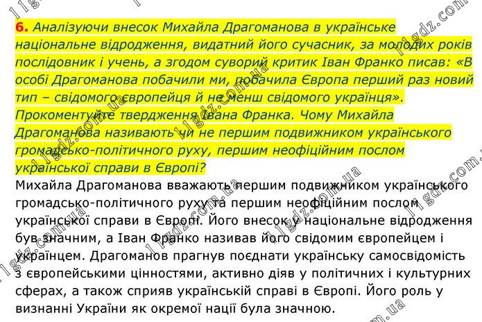 Аналізуючи внесок Михайла Драгоманова в українське національне відродження, видатний його сучасник, за молодих років послідовник і учень, а згодом суворий критик Іван Франко писав: «В особі Драгоманова побачили ми, побачила Європа перший раз новий тип – свідомого європейця й не менш свідомого українця». Прокоментуйте твердження Івана Франка. Чому Михайла Драгоманова називають чи не першим подвижником українського громадсько-політичного руху, першим неофіційним послом української справи в Європі? Михайла Драгоманова вважають першим подвижником українського громадсько-політичного руху та першим неофіційним послом української справи в Європі. Його внесок у національне відродження був значним, а Іван Франко називав його свідомим європейцем і українцем. Драгоманов прагнув поєднати українську самосвідомість з європейськими цінностями, активно діяв у політичних і культурних сферах, а також сприяв українській справі в Європі. Його роль у визнанні України як окремої нації була значною.