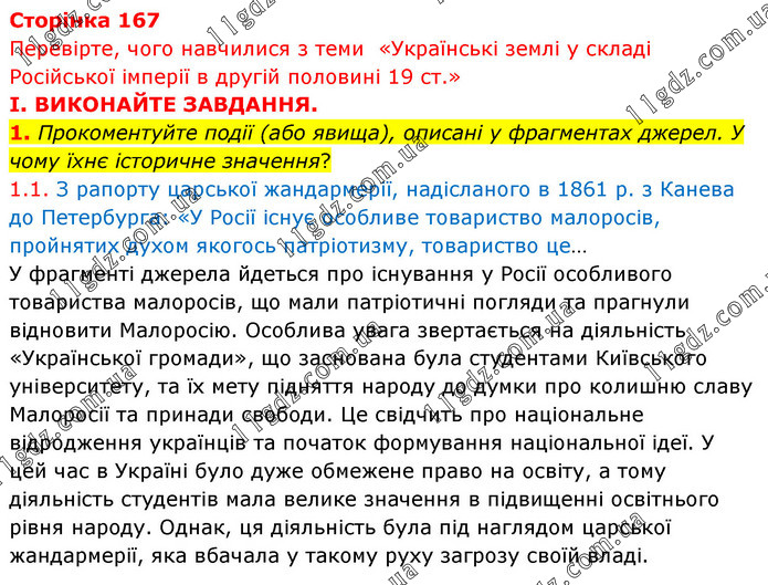 Перевірте, чого навчилися з теми «Українські землі у складі Російської імперії в другій половині 19 ст.» І. ВИКОНАЙТЕ ЗАВДАННЯ. 1. Прокоментуйте події (або явища), описані у фрагментах джерел. У чому їхнє історичне значення? 1.1. З рапорту царської жандармерії, надісланого в 1861 р. з Канева до Петербурга: «У Росії існує особливе товариство малоросів, пройнятих духом якогось патріотизму, товариство це… У фрагменті джерела йдеться про існування у Росії особливого товариства малоросів, що мали патріотичні погляди та прагнули відновити Малоросію. Особлива увага звертається на діяльність «Української громади», що заснована була студентами Київського університету, та їх мету підняття народу до думки про колишню славу Малоросії та принади свободи. Це свідчить про національне відродження українців та початок формування національної ідеї. У цей час в Україні було дуже обмежене право на освіту, а тому діяльність студентів мала велике значення в підвищенні освітнього рівня народу. Однак, ця діяльність була під наглядом царської жандармерії, яка вбачала у такому руху загрозу своїй владі.