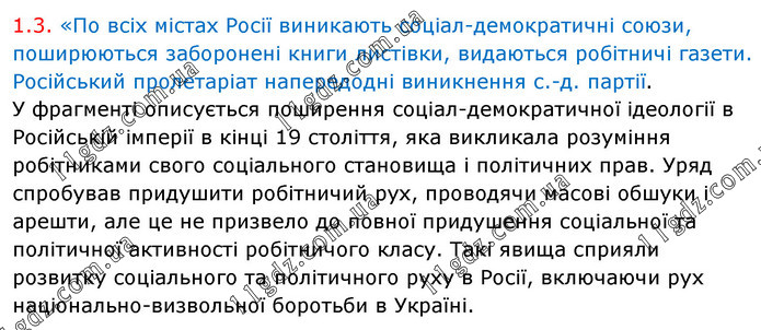 1.3. «По всіх містах Росії виникають соціал-демократичні союзи, поширюються заборонені книги листівки, видаються робітничі газети. Російський пролетаріат напередодні виникнення с.-д. партії. У фрагменті описується поширення соціал-демократичної ідеології в Російській імперії в кінці 19 століття, яка викликала розуміння робітниками свого соціального становища і політичних прав. Уряд спробував придушити робітничий рух, проводячи масові обшуки і арешти, але це не призвело до повної придушення соціальної та політичної активності робітничого класу. Такі явища сприяли розвитку соціального та політичного руху в Росії, включаючи рух національно-визвольної боротьби в Україні.
