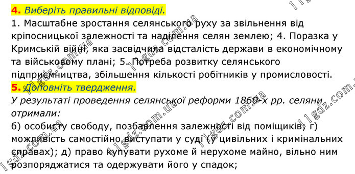 4. Виберіть правильні відповіді. 1. Масштабне зростання селянського руху за звільнення від кріпосницької залежності та наділення селян землею; 4. Поразка у Кримській війні, яка засвідчила відсталість держави в економічному та військовому плані; 5. Потреба розвитку селянського підприємництва, збільшення кількості робітників у промисловості. 5. Доповніть твердження. У результаті проведення селянської реформи 1860-х рр. селяни отримали: б) особисту свободу, позбавлення залежності від поміщиків; г) можливість самостійно виступати у суді (у цивільних і кримінальних справах); д) право купувати рухоме й нерухоме майно, вільно ним розпоряджатися та одержувати його у спадок;
