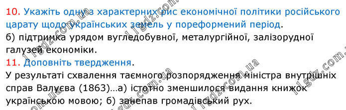 10. Укажіть одну з характерних рис економічної політики російського царату щодо українських земель у пореформений період. б) підтримка урядом вугледобувної, металургійної, залізорудної галузей економіки. 11. Доповніть твердження. У результаті схвалення таємного розпорядження міністра внутрішніх справ Валуєва (1863)…а) істотно зменшилося видання книжок українською мовою; б) занепав громадівський рух.