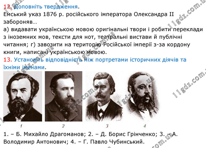 12. Доповніть твердження. Емський указ 1876 р. російського імператора Олександра ІІ забороняв… а) видавати українською мовою оригінальні твори і робити переклади з іноземних мов, тексти для нот, театральні вистави й публічні читання; г) завозити на територію Російської імперії з-за кордону книги, написані українською мовою. 13. Установіть відповідність між портретами історичних діячів та їхніми іменами. 1. – Б. Михайло Драгоманов; 2. – Д. Борис Грінченко; 3. – А. Володимир Антонович; 4. – Г. Павло Чубинський.