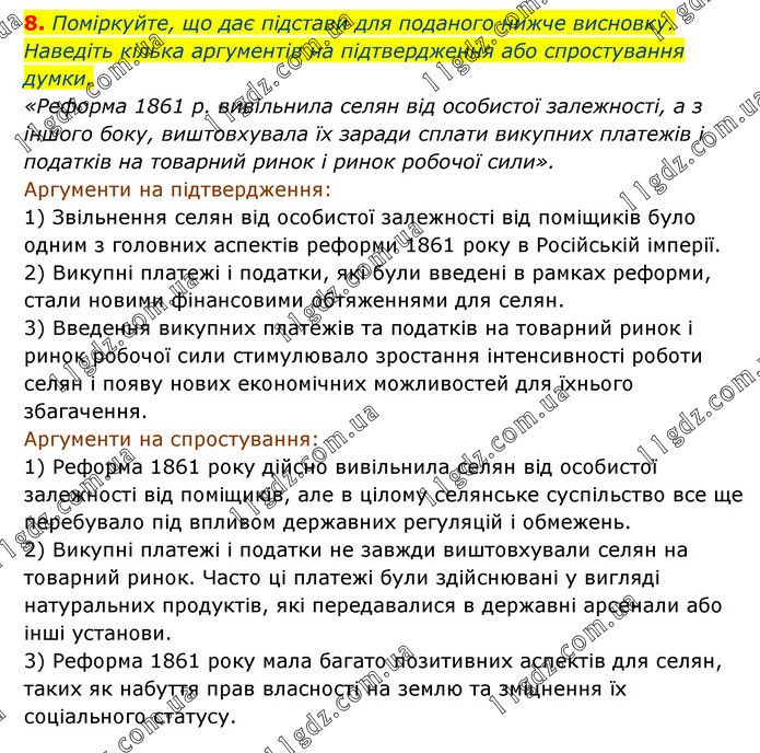 Поміркуйте, що дає підстави для поданого нижче висновку. Наведіть кілька аргументів на підтвердження або спростування думки. «Реформа 1861 р. вивільнила селян від особистої залежності, а з іншого боку, виштовхувала їх заради сплати викупних платежів і податків на товарний ринок і ринок робочої сили». Аргументи на підтвердження: 1) Звільнення селян від особистої залежності від поміщиків було одним з головних аспектів реформи 1861 року в Російській імперії. 2) Викупні платежі і податки, які були введені в рамках реформи, стали новими фінансовими обтяженнями для селян. 3) Введення викупних платежів та податків на товарний ринок і ринок робочої сили стимулювало зростання інтенсивності роботи селян і появу нових економічних можливостей для їхнього збагачення. Аргументи на спростування: 1) Реформа 1861 року дійсно вивільнила селян від особистої залежності від поміщиків, але в цілому селянське суспільство все ще перебувало під впливом державних регуляцій і обмежень. 2) Викупні платежі і податки не завжди виштовхували селян на товарний ринок. Часто ці платежі були здійснювані у вигляді натуральних продуктів, які передавалися в державні арсенали або інші установи. 3) Реформа 1861 року мала багато позитивних аспектів для селян, таких як набуття прав власності на землю та зміцнення їх соціального статусу.