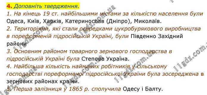 Доповніть твердження. 1. На кінець 19 ст. найбільшими містами за кількістю населення були Одеса, Київ, Харків, Катеринослав (Дніпро), Миколаїв. 2. Територіями, які стали осередками цукробурякового виробництва в пореформеній підросійській Україні, були Південно Західний райони 3. Основним районом товарного зернового господарства в підросійській Україні була Степова Україна. 4. Найбільша кількість найманих робітників у сільському господарстві пореформеної підросійської України була зосереджена в зернових районах країни. 5. Перша залізниця у 1865 р. сполучила Одесу і Балту.