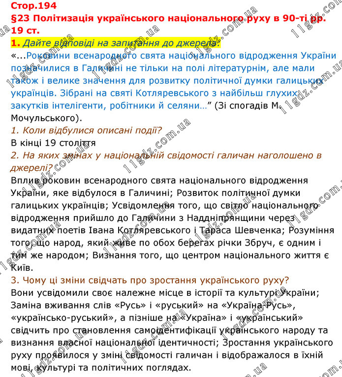 §23 Політизація українського національного руху в 90-ті рр. 19 ст. 1. Дайте відповіді на запитання до джерела: «...Роковини всенародного свята національного відродження України позначилися в Галичині не тільки на полі літературнім, але мали також і велике значення для розвитку політичної думки галицьких українців. Зібрані на святі Котляревського з найбільш глухих закутків інтелігенти, робітники й селяни…” (Зі спогадів М. Мочульського). 1. Коли відбулися описані події? В кінці 19 століття 2. На яких змінах у національній свідомості галичан наголошено в джерелі? Вплив роковин всенародного свята національного відродження України, яке відбулося в Галичині; Розвиток політичної думки галицьких українців; Усвідомлення того, що світло національного відродження прийшло до Галичини з Наддніпрянщини через видатних поетів Івана Котляревського і Тараса Шевченка; Розуміння того, що народ, який живе по обох берегах річки Збруч, є одним і тим же народом; Визнання того, що центром національного життя є Київ. 3. Чому ці зміни свідчать про зростання українського руху? Вони усвідомили своє належне місце в історії та культурі України; Заміна вживання слів «Русь» і «руський» на «Україна-Русь», «українсько-руський», а пізніше на «Україна» і «український» свідчить про становлення самоідентифікації українського народу та визнання власної національної ідентичності; Зростання українського руху проявилося у зміні свідомості галичан і відображалося в їхній мові, культурі та політичних поглядах.