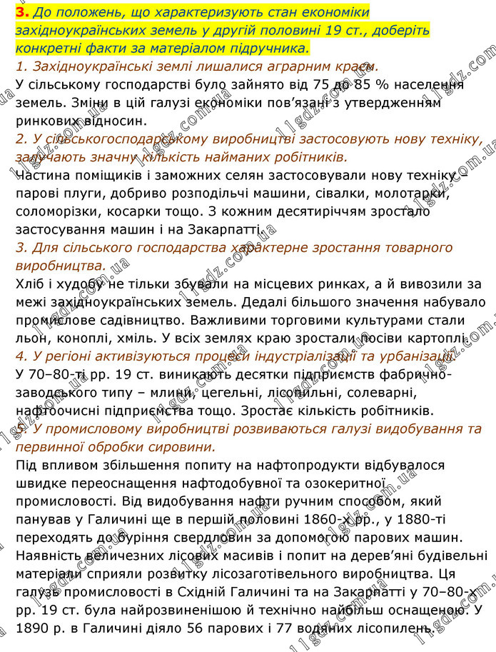 До положень, що характеризують стан економіки західноукраїнських земель у другій половині 19 ст., доберіть конкретні факти за матеріалом підручника. 1. Західноукраїнські землі лишалися аграрним краєм. У сільському господарстві було зайнято від 75 до 85 % населення земель. Зміни в цій галузі економіки пов’язані з утвердженням ринкових відносин. 2. У сільськогосподарському виробництві застосовують нову техніку, залучають значну кількість найманих робітників. Частина поміщиків і заможних селян застосовували нову техніку – парові плуги, добриво розподільчі машини, сівалки, молотарки, соломорізки, косарки тощо. З кожним десятиріччям зростало застосування машин і на Закарпатті. 3. Для сільського господарства характерне зростання товарного виробництва. Хліб і худобу не тільки збували на місцевих ринках, а й вивозили за межі західноукраїнських земель. Дедалі більшого значення набувало промислове садівництво. Важливими торговими культурами стали льон, коноплі, хміль. У всіх землях краю зростали посіви картоплі. 4. У регіоні активізуються процеси індустріалізації та урбанізації. У 70–80-ті рр. 19 ст. виникають десятки підприємств фабрично-заводського типу – млини, цегельні, лісопильні, солеварні, нафтоочисні підприємства тощо. Зростає кількість робітників. 5. У промисловому виробництві розвиваються галузі видобування та первинної обробки сировини. Під впливом збільшення попиту на нафтопродукти відбувалося швидке переоснащення нафтодобувної та озокеритної промисловості. Від видобування нафти ручним способом, який панував у Галичині ще в першій половині 1860-х рр., у 1880-ті переходять до буріння свердловин за допомогою парових машин. Наявність величезних лісових масивів і попит на дерев’яні будівельні матеріали сприяли розвитку лісозаготівельного виробництва. Ця галузь промисловості в Східній Галичині та на Закарпатті у 70–80-х рр. 19 ст. була найрозвиненішою й технічно найбільш оснащеною. У 1890 р. в Галичині діяло 56 парових і 77 водяних лісопилень.