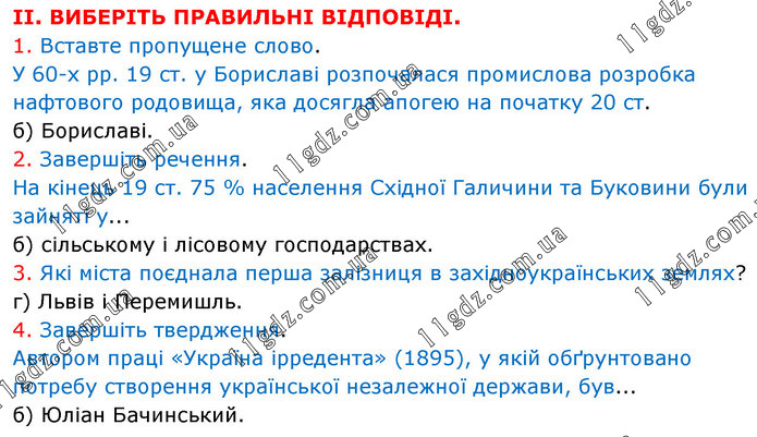 ІІ. ВИБЕРІТЬ ПРАВИЛЬНІ ВІДПОВІДІ. 1. Вставте пропущене слово. У 60-х рр. 19 ст. у Бориславі розпочалася промислова розробка нафтового родовища, яка досягла апогею на початку 20 ст. б) Бориславі. 2. Завершіть речення. На кінець 19 ст. 75 % населення Східної Галичини та Буковини були зайняті у... б) сільському і лісовому господарствах. 3. Які міста поєднала перша залізниця в західноукраїнських землях? г) Львів і Перемишль. 4. Завершіть твердження. Автором праці «Україна ірредента» (1895), у якій обґрунтовано потребу створення української незалежної держави, був... б) Юліан Бачинський.