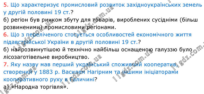 5. Що характеризує промисловий розвиток західноукраїнських земель у другій половині 19 ст.? б) регіон був ринком збуту для товарів, вироблених сусідніми (більш розвиненими) промисловими регіонами. 6. Що з переліченого стосується особливостей економічного життя підавстрійської України в другій половині 19 ст.? б) найрозвинутішою й технічно найбільш оснащеною галуззю було лісозаготівельне виробництво. 7. Яку назву мав перший український споживчий кооператив, створений у 1883 р. Василем Нагірним та іншими ініціаторами кооперативного руху в Галичині? а) «Народна торгівля».