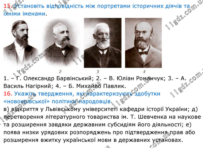 15. Установіть відповідність між портретами історичних діячів та їхніми іменами. 1. – Г. Олександр Барвінський; 2. – В. Юліан Романчук; 3. – А. Василь Нагірний; 4. – Б. Михайло Павлик. 16. Укажіть твердження, які характеризують здобутки «новоерівської» політики народовців. в) відкриття у Львівському університеті кафедри історії України; д) перетворення літературного товариства ім. Т. Шевченка на наукове та розширення завдяки державним субсидіям його діяльності; е) поява низки урядових розпоряджень про підтвердження прав або розширення вжитку української мови в державних установах.