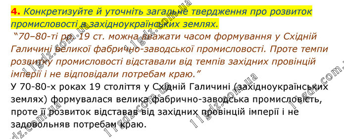 Конкретизуйте й уточніть загальне твердження про розвиток промисловості в західноукраїнських землях. “70–80-ті рр. 19 ст. можна вважати часом формування у Східній Галичині великої фабрично-заводської промисловості. Проте темпи розвитку промисловості відставали від темпів західних провінцій імперії і не відповідали потребам краю.” У 70-80-х роках 19 століття у Східній Галичині (західноукраїнських землях) формувалася велика фабрично-заводська промисловість, проте її розвиток відставав від західних провінцій імперії і не задовольняв потребам краю.