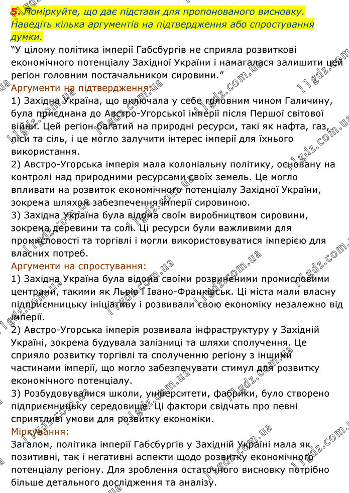 Поміркуйте, що дає підстави для пропонованого висновку. Наведіть кілька аргументів на підтвердження або спростування думки. “У цілому політика імперії Габсбургів не сприяла розвиткові економічного потенціалу Західної України і намагалася залишити цей регіон головним постачальником сировини.” Аргументи на підтвердження: 1) Західна Україна, що включала у себе головним чином Галичину, була приєднана до Австро-Угорської імперії після Першої світової війни. Цей регіон багатий на природні ресурси, такі як нафта, газ, ліси та сіль, і це могло залучити інтерес імперії для їхнього використання. 2) Австро-Угорська імперія мала колоніальну політику, основану на контролі над природними ресурсами своїх земель. Це могло впливати на розвиток економічного потенціалу Західної України, зокрема шляхом забезпечення імперії сировиною. 3) Західна Україна була відома своїм виробництвом сировини, зокрема деревини та солі. Ці ресурси були важливими для промисловості та торгівлі і могли використовуватися імперією для власних потреб. Аргументи на спростування: 1) Західна Україна була відома своїми розвиненими промисловими центрами, такими як Львів і Івано-Франківськ. Ці міста мали власну підприємницьку ініціативу і розвивали свою економіку незалежно від імперії. 2) Австро-Угорська імперія розвивала інфраструктуру у Західній Україні, зокрема будувала залізниці та шляхи сполучення. Це сприяло розвитку торгівлі та сполученню регіону з іншими частинами імперії, що могло забезпечувати стимул для розвитку економічного потенціалу. 3) Розбудовувалися школи, університети, фабрики, було створено підприємницьку середовище. Ці фактори свідчать про певні сприятливі умови для розвитку економіки. Міркування: Загалом, політика імперії Габсбургів у Західній Україні мала як позитивні, так і негативні аспекти щодо розвитку економічного потенціалу регіону. Для зроблення остаточного висновку потрібно більше детального дослідження та аналізу.