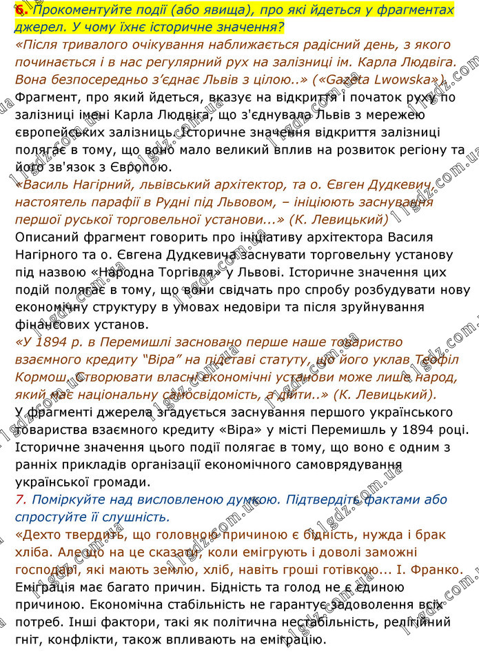 Прокоментуйте події (або явища), про які йдеться у фрагментах джерел. У чому їхнє історичне значення? «Після тривалого очікування наближається радісний день, з якого починається і в нас регулярний рух на залізниці ім. Карла Людвіга. Вона безпосередньо з’єднає Львів з цілою..» («Gazeta Lwowska»). Фрагмент, про який йдеться, вказує на відкриття і початок руху по залізниці імені Карла Людвіга, що з'єднувала Львів з мережею європейських залізниць. Історичне значення відкриття залізниці полягає в тому, що воно мало великий вплив на розвиток регіону та його зв'язок з Європою. «Василь Нагірний, львівський архітектор, та о. Євген Дудкевич, настоятель парафії в Рудні під Львовом, – ініціюють заснування першої руської торговельної установи...» (К. Левицький) Описаний фрагмент говорить про ініціативу архітектора Василя Нагірного та о. Євгена Дудкевича заснувати торговельну установу під назвою «Народна Торгівля» у Львові. Історичне значення цих подій полягає в тому, що вони свідчать про спробу розбудувати нову економічну структуру в умовах недовіри та після зруйнування фінансових установ. «У 1894 р. в Перемишлі засновано перше наше товариство взаємного кредиту “Віра” на підставі статуту, що його уклав Теофіл Кормош. Створювати власні економічні установи може лише народ, який має національну самосвідомість, а дійти..» (К. Левицький). У фрагменті джерела згадується заснування першого українського товариства взаємного кредиту «Віра» у місті Перемишль у 1894 році. Історичне значення цього події полягає в тому, що воно є одним з ранніх прикладів організації економічного самоврядування української громади. 7. Поміркуйте над висловленою думкою. Підтвердіть фактами або спростуйте її слушність. «Дехто твердить, що головною причиною є бідність, нужда і брак хліба. Але що на це сказати, коли емігрують і доволі заможні господарі, які мають землю, хліб, навіть гроші готівкою... І. Франко. Еміграція має багато причин. Бідність та голод не є єдиною причиною. Економічна стабільність не гарантує задоволення всіх потреб. Інші фактори, такі як політична нестабільність, релігійний гніт, конфлікти, також впливають на еміграцію.