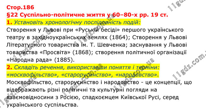 §22 Суспільно-політичне життя у 60–80-х рр. 19 ст. 1. Установіть хронологічну послідовність подій: Створення у Львові при «Руській бесіді» першого українського театру в західноукраїнських землях (1864); Створення у Львові Літературного товариства ім. Т. Шевченка; заснування у Львові товариства «Просвіта» (1868); створення політичної організації «Народна рада» (1885). 2. Складіть речення, використавши поняття і терміни: «москвофільство», «старорусинство», «народовство». Москвофільство, старорусинство і народовство - це концепції, що відображають різні політичні та культурні погляди на взаємовідносини з Росією, спадкоємцем Київської Русі, серед українського суспільства.
