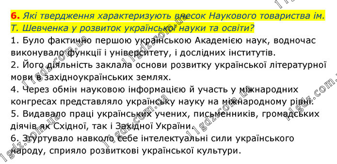 Які твердження характеризують внесок Наукового товариства ім. Т. Шевченка у розвиток української науки та освіти? 1. Було фактично першою українською Академією наук, водночас виконувало функції і університету, і дослідних інститутів. 2. Його діяльність заклала основи розвитку української літературної мови в західноукраїнських землях. 4. Через обмін науковою інформацією й участь у міжнародних конгресах представляло українську науку на міжнародному рівні. 5. Видавало праці українських учених, письменників, громадських діячів як Східної, так і Західної України. 6. Згуртувало навколо себе інтелектуальні сили українського народу, сприяло розвиткові української культури.