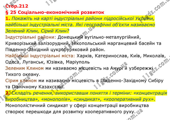 § 25 Соціально-економічний розвиток 1. Покажіть на карті індустріальні райони підросійської України, найбільші індустріальні міста. Які географічні об’єкти називаємо Зелений Клин, Сірий Клин? Індустріальні райони: Донецький вугільно-металургійний, Криворізький залізорудний, Нікопольський марганцевий басейн та Південно-Західний цукробуряковий район. Найбільші індустріальні міста: Харків, Катеринослав, Київ, Миколаїв, Одеса, Луганськ, Юзівка, Маріуполь Зеленим Клином ми називаємо місцевість на Амурі й узбережжі Тихого океану. Сірим клином ми називаємо місцевість в Південно-Західному Сибіру та Північному Казахстані. 2. Складіть речення, використавши поняття і терміни: «концентрація виробництва», «монополія», «синдикат», «кооперативний рух». Монополістичний синдикат у сфері концентрації виробництва створює перешкоди для розвитку кооперативного руху.