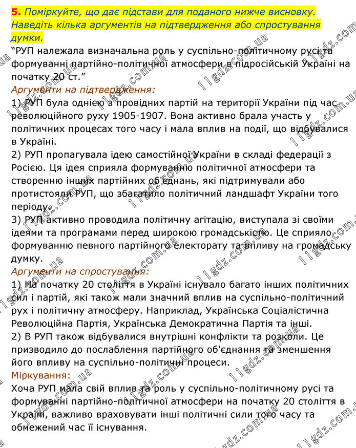Поміркуйте, що дає підстави для поданого нижче висновку. Наведіть кілька аргументів на підтвердження або спростування думки. “РУП належала визначальна роль у суспільно-політичному русі та формуванні партійно-політичної атмосфери в підросійській Україні на початку 20 ст.” Аргументи на підтвердження: 1) РУП була однією з провідних партій на території України під час революційного руху 1905-1907. Вона активно брала участь у політичних процесах того часу і мала вплив на події, що відбувалися в Україні. 2) РУП пропагувала ідею самостійної України в складі федерації з Росією. Ця ідея сприяла формуванню політичної атмосфери та створенню інших партійних об'єднань, які підтримували або протистояли РУП, що збагатило політичний ландшафт України того періоду. 3) РУП активно проводила політичну агітацію, виступала зі своїми ідеями та програмами перед широкою громадськістю. Це сприяло формуванню певного партійного електорату та впливу на громадську думку. Аргументи на спростування: 1) На початку 20 століття в Україні існувало багато інших політичних сил і партій, які також мали значний вплив на суспільно-політичний рух і політичну атмосферу. Наприклад, Українська Соціалістична Революційна Партія, Українська Демократична Партія та інші. 2) В РУП також відбувалися внутрішні конфлікти та розколи. Це призводило до послаблення партійного об'єднання та зменшення його впливу на суспільно-політичні процеси. Міркування: Хоча РУП мала свій вплив та роль у суспільно-політичному русі та формуванні партійно-політичної атмосфери на початку 20 століття в Україні, важливо враховувати інші політичні сили того часу та обмежений час її існування.