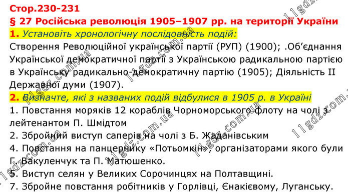 § 27 Російська революція 1905–1907 рр. на території України 1. Установіть хронологічну послідовність подій: Створення Революційної української партії (РУП) (1900); .Об’єднання Української демократичної партії з Українською радикальною партією в Українську радикально-демократичну партію (1905); Діяльність ІІ Державної думи (1907). 2. Визначте, які з названих подій відбулися в 1905 р. в Україні 1. Повстання моряків 12 кораблів Чорноморського флоту на чолі з лейтенантом П. Шмідтом 2. Збройний виступ саперів на чолі з Б. Жаданівським 4. Повстання на панцернику «Потьомкін», організаторами якого були Г. Вакуленчук та П. Матюшенко. 5. Виступ селян у Великих Сорочинцях на Полтавщині. 7. Збройне повстання робітників у Горлівці, Єнакієвому, Луганську.