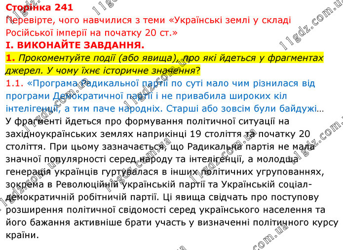 Перевірте, чого навчилися з теми «Українські землі у складі Російської імперії на початку 20 ст.» І. ВИКОНАЙТЕ ЗАВДАННЯ. 1. Прокоментуйте події (або явища), про які йдеться у фрагментах джерел. У чому їхнє історичне значення? 1.1. «Програма Радикальної партії по суті мало чим різнилася від програми Демократичної партії і не привабила широких кіл інтелігенції, а тим паче народніх. Старші або зовсім були байдужі… У фрагменті йдеться про формування політичної ситуації на західноукраїнських землях наприкінці 19 століття та початку 20 століття. При цьому зазначається, що Радикальна партія не мала значної популярності серед народу та інтелігенції, а молодша генерація українців гуртувалася в інших політичних угрупованнях, зокрема в Революційній українській партії та Українській соціал-демократичній робітничій партії. Ці явища свідчать про поступову розширення політичної свідомості серед українського населення та його бажання активніше брати участь у визначенні політичного курсу країни.
