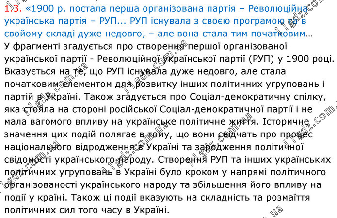 1.3. «1900 р. постала перша організована партія – Революційна українська партія – РУП... РУП існувала з своєю програмою та в свойому складі дуже недовго, – але вона стала тим початковим… У фрагменті згадується про створення першої організованої української партії - Революційної української партії (РУП) у 1900 році. Вказується на те, що РУП існувала дуже недовго, але стала початковим елементом для розвитку інших політичних угруповань і партій в Україні. Також згадується про Соціал-демократичну спілку, яка стояла на стороні російської Соціал-демократичної партії і не мала вагомого впливу на українське політичне життя. Історичне значення цих подій полягає в тому, що вони свідчать про процес національного відродження в Україні та зародження політичної свідомості українського народу. Створення РУП та інших українських політичних угруповань в Україні було кроком у напрямі політичного організованості українського народу та збільшення його впливу на події у країні. Також ці події вказують на складність та розмаїття політичних сил того часу в Україні.
