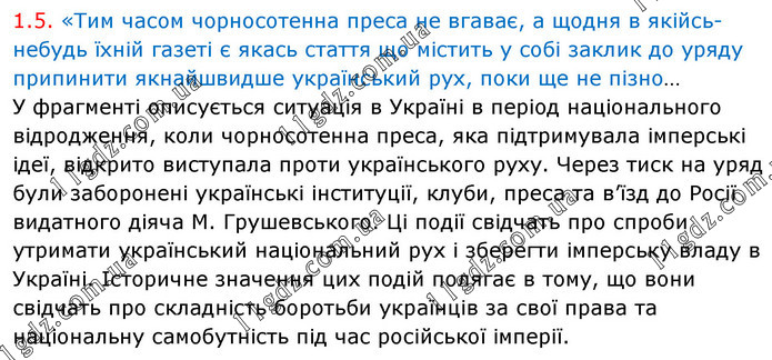 1.5. «Тим часом чорносотенна преса не вгаває, а щодня в якійсь-небудь їхній газеті є якась стаття що містить у собі заклик до уряду припинити якнайшвидше український рух, поки ще не пізно… У фрагменті описується ситуація в Україні в період національного відродження, коли чорносотенна преса, яка підтримувала імперські ідеї, відкрито виступала проти українського руху. Через тиск на уряд були заборонені українські інституції, клуби, преса та в’їзд до Росії видатного діяча М. Грушевського. Ці події свідчать про спроби утримати український національний рух і зберегти імперську владу в Україні. Історичне значення цих подій полягає в тому, що вони свідчать про складність боротьби українців за свої права та національну самобутність під час російської імперії.