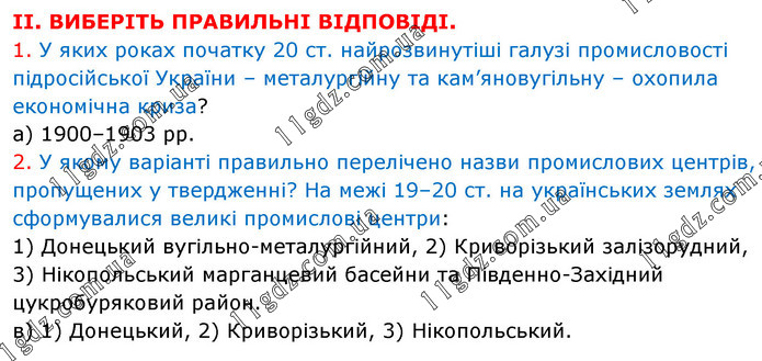 ІІ. ВИБЕРІТЬ ПРАВИЛЬНІ ВІДПОВІДІ. 1. У яких роках початку 20 ст. найрозвинутіші галузі промисловості підросійської України – металургійну та кам’яновугільну – охопила економічна криза? а) 1900–1903 рр. 2. У якому варіанті правильно перелічено назви промислових центрів, пропущених у твердженні? На межі 19–20 ст. на українських землях сформувалися великі промислові центри: 1) Донецький вугільно-металургійний, 2) Криворізький залізорудний, 3) Нікопольський марганцевий басейни та Південно-Західний цукробуряковий район. в) 1) Донецький, 2) Криворізький, 3) Нікопольський.