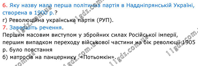 6. Яку назву мала перша політична партія в Наддніпрянській Україні, створена в 1900 р.? г) Революційна українська партія (РУП). 7. Завершіть речення. Першим масовим виступом у збройних силах Російської імперії, першим випадком переходу військової частини на бік революції 1905 р. було повстання б) матросів на панцернику «Потьомкін».