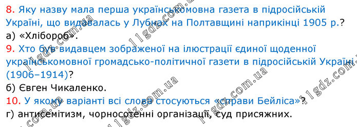 8. Яку назву мала перша українськомовна газета в підросійській Україні, що видавалась у Лубнах на Полтавщині наприкінці 1905 р.? а) «Хлібороб». 9. Хто був видавцем зображеної на ілюстрації єдиної щоденної українськомовної громадсько-політичної газети в підросійській Україні (1906–1914)? б) Євген Чикаленко. 10. У якому варіанті всі слова стосуються «справи Бейліса»? г) антисемітизм, чорносотенні організації, суд присяжних.