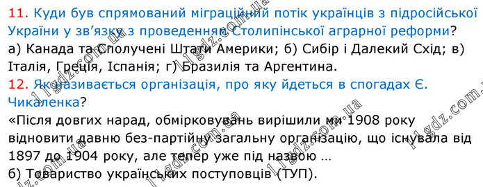 11. Куди був спрямований міграційний потік українців з підросійської України у зв’язку з проведенням Столипінської аграрної реформи? а) Канада та Сполучені Штати Америки; б) Сибір і Далекий Схід; в) Італія, Греція, Іспанія; г) Бразилія та Аргентина. 12. Як називається організація, про яку йдеться в спогадах Є. Чикаленка? «Після довгих нарад, обмірковувань вирішили ми 1908 року відновити давню без-партійну загальну організацію, що існувала від 1897 до 1904 року, але тепер уже під назвою … б) Товариство українських поступовців (ТУП).