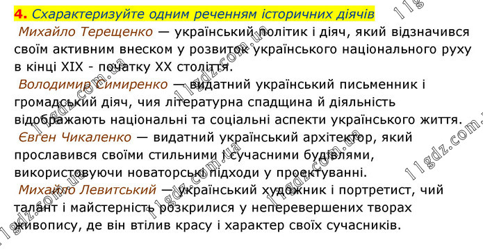 Схарактеризуйте одним реченням історичних діячів Михайло Терещенко — український політик і діяч, який відзначився своїм активним внеском у розвиток українського національного руху в кінці XIX - початку XX століття. Володимир Симиренко — видатний український письменник і громадський діяч, чия літературна спадщина й діяльність відображають національні та соціальні аспекти українського життя. Євген Чикаленко — видатний український архітектор, який прославився своїми стильними і сучасними будівлями, використовуючи новаторські підходи у проектуванні. Михайло Левитський — український художник і портретист, чий талант і майстерність розкрилися у неперевершених творах живопису, де він втілив красу і характер своїх сучасників.