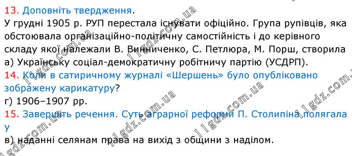 13. Доповніть твердження. У грудні 1905 р. РУП перестала існувати офіційно. Група рупівців, яка обстоювала організаційно-політичну самостійність і до керівного складу якої належали В. Винниченко, С. Петлюра, М. Порш, створила а) Українську соціал-демократичну робітничу партію (УСДРП). 14. Коли в сатиричному журналі «Шершень» було опубліковано зображену карикатуру? г) 1906–1907 рр. 15. Завершіть речення. Суть аграрної реформи П. Столипіна полягала у в) наданні селянам права на вихід з общини з наділом.