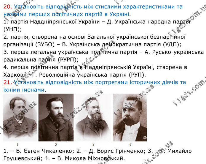 20. Установіть відповідність між стислими характеристиками та назвами перших політичних партій в Україні. 1. партія Наддніпрянської України – Д. Українська народна партія (УНП); 2. партія, створена на основі Загальної української безпартійної організації (ЗУБО) – В. Українська демократична партія (УДП); 3. перша легальна українська політична партія – А. Русько-українська радикальна партія (РУРП); 4. перша політична партія в Наддніпрянській Україні, створена в Харкові – Г. Революційна українська партія (РУП). 21. Установіть відповідність між портретами історичних діячів та їхніми іменами. 1. – Б. Євген Чикаленко; 2. – Д. Борис Грінченко; 3. – Г. Михайло Грушевський; 4. – В. Микола Міхновський.