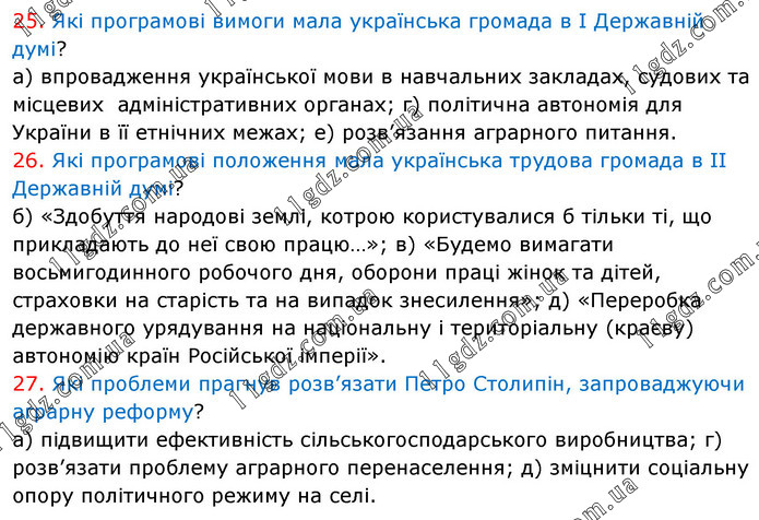 25. Які програмові вимоги мала українська громада в І Державній думі? а) впровадження української мови в навчальних закладах, судових та місцевих адміністративних органах; г) політична автономія для України в її етнічних межах; е) розв’язання аграрного питання. 26. Які програмові положення мала українська трудова громада в ІІ Державній думі? б) «Здобуття народові землі, котрою користувалися б тільки ті, що прикладають до неї свою працю…»; в) «Будемо вимагати восьмигодинного робочого дня, оборони праці жінок та дітей, страховки на старість та на випадок знесилення»; д) «Переробка державного урядування на національну і територіальну (краєву) автономію країн Російської імперії». 27. Які проблеми прагнув розв’язати Петро Столипін, запроваджуючи аграрну реформу? а) підвищити ефективність сільськогосподарського виробництва; г) розв’язати проблему аграрного перенаселення; д) зміцнити соціальну опору політичного режиму на селі.
