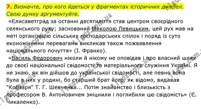 Визначте, про кого йдеться у фрагментах історичних джерел. Свою думку аргументуйте. «Єлисаветград за останні десятиліття став центром своєрідного селянського руху; заснований Миколою Левицьким, цей рух мав на меті організацію сільських господарських спілок і поряд із суто економічними перевагами викликав також пожвавлення національного почуття» (І. Франко). «Василь Федорович ніколи й нікому не оповідав і про власний шлях до своєї національної свідомості та матеріального служіння Україні. Я не знаю, як він дійшов до української свідомості, але певно вона була в них у родині, бо старший брат його, як відомо, видавав “Кобзаря“ Т. Г. Шевченка... Потім знайомство і близькість з професором В. Антоновичем зміцнили і поглибили цю свідомість» (Є. Чикаленко).